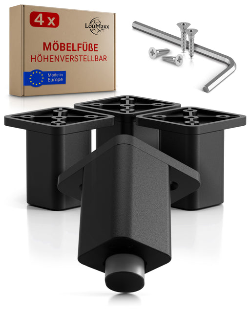 Vollständige Details anzeigenLouMaxx Möbelfüße verstellbar – 4er Set 38x38x60mm in Schwarz inkl. Befestigungsplatte – Füsse für Schränke passend als Kallax Füße – Hochwertige Schrank Füße für individuelle DIY-Möbel
