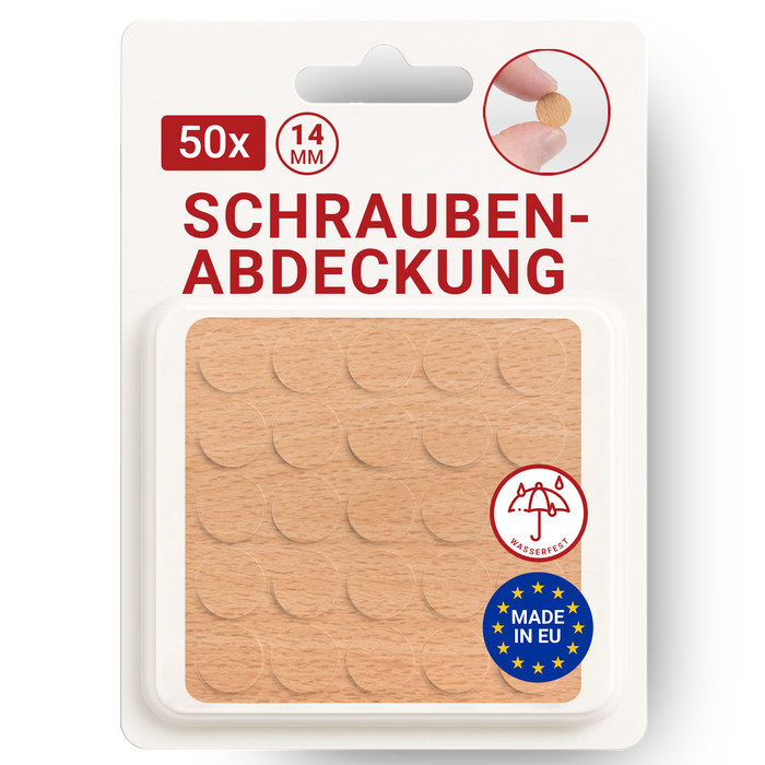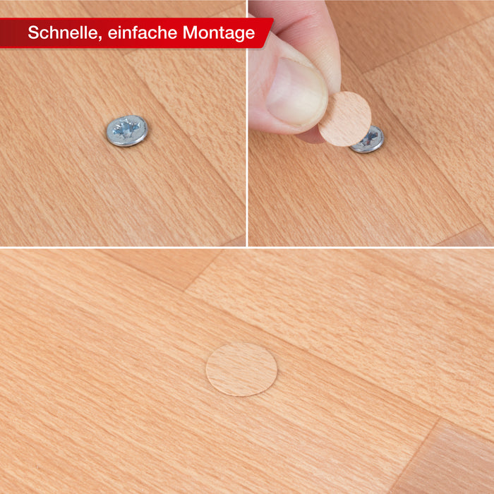 • LIEFERUMFANG & FARBEN: Enthalten sind 50 Stück Schraubenkopfabdeckung mit einem Durchmesser von 14 mm. Erhältlich in Weiß, Buche, Ahorn und weiteren Farben (geringe Farbabweichungen möglich). Die Abdeckkappen sind für den einmaligen Gebrauch vorgesehen.