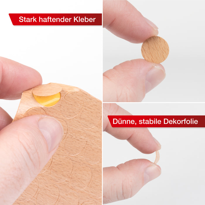 • PERFEKT KASCHIERT: Die selbstklebenden Schraubenabdeckungen fungieren als Schrauben Abdeckkappen, Bohrloch Abdeckkappen oder ermöglichen es, kleinere Oberflächenschäden nahezu unsichtbar zu überdecken. Dank ihrer flachen Form fügen sich die Möbelpflaster harmonisch in die Oberfläche ein – für eine saubere und gleichmäßige Optik.