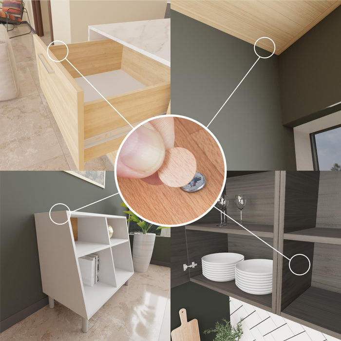 • VIELSEITIGE ANWENDUNG: Die Abdeckkappen haften zuverlässig auf glatten Oberflächen und eignen sich hervorragend für Schränke, Regale, Paneelendecken, Holzverkleidungen, Küchenmöbel sowie Möbel beliebter schwedischer Hersteller. Auch als Lösung zum Fliesen Löcher verdecken oder als Möbelsticker im Wohnmobil sind sie ideal – zum Beispiel als Abdeckkappen für Schrauben.
