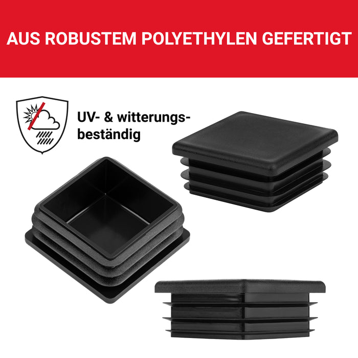 QUALITÄT: Die Vierkantrohr Kunststoff Stopfen sind aus hochwertigem Polyethylen gefertigt. Dadurch sind die Kunststoffkappen für Rohre besonders robust, UV-beständig und witterungsbeständig. Die Kunststoff Stopfen passen für einen Außenrohrdurchmesser von 50x50 mm. Damit eignet sich der Rohr Stöpsel für ein Formrohr 50x50 mit Innenrohrdurchmesser von 47mm bis max. 48,5 mm.