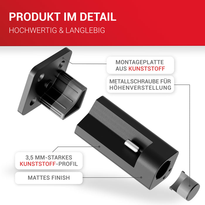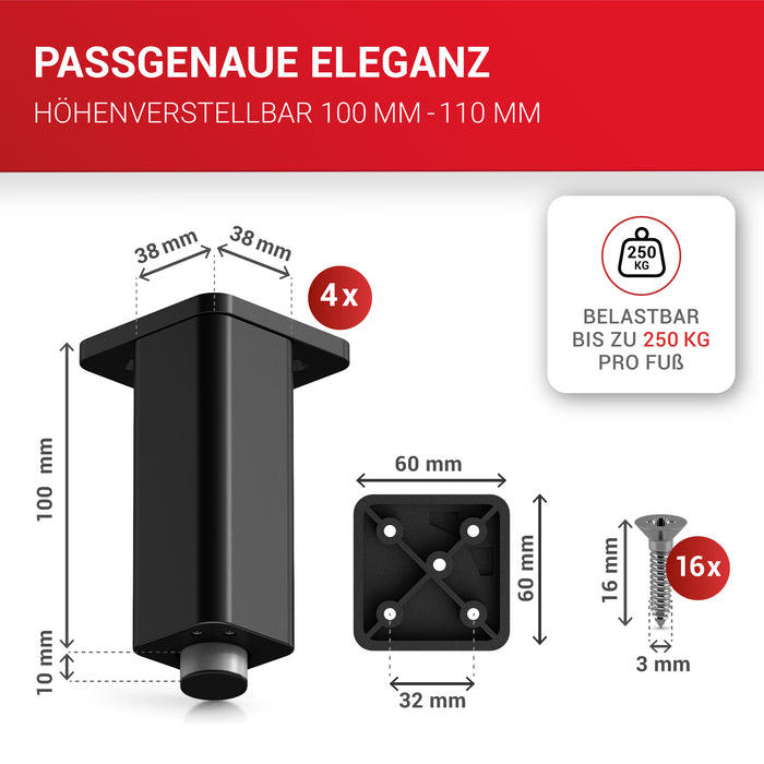 • ✔️LIEFERUMFANG: 4er Set höhenverstellbare Füße 38x38x100mm in der Farbe Schwarz, inklusive Montageplatte, 16 Montageschrauben und Inbusschlüssel; Material: Möbelfuß und Montageplatte aus ABS-Kunststoff
