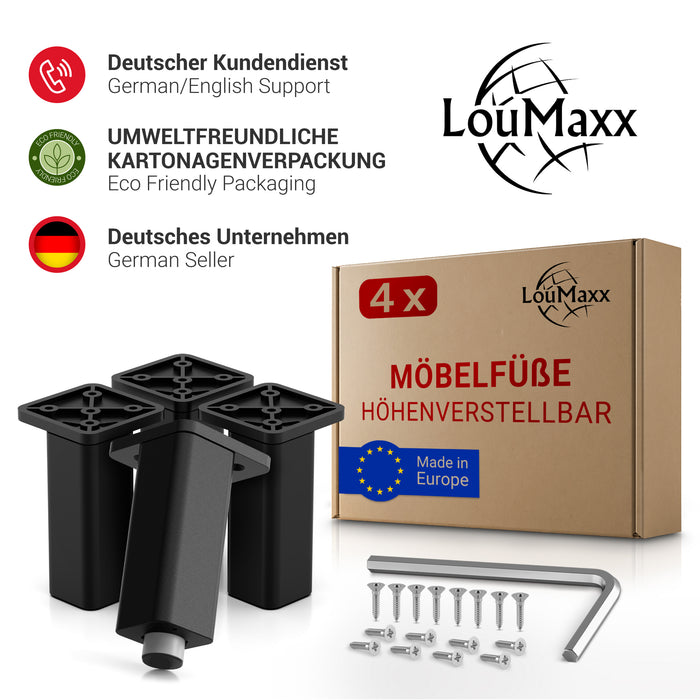 LouMaxx Möbelfüße verstellbar – 4er Set 38x38x100mm in Schwarz inkl. Befestigungsplatte – Füsse für Schränke passend als Kallax Füße – Hochwertige Schrank Füße für individuelle DIY-Möbel