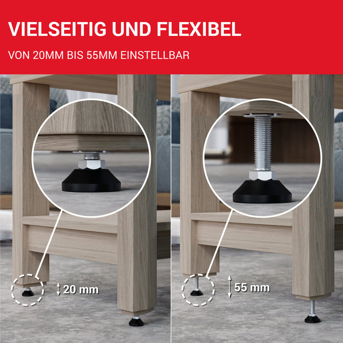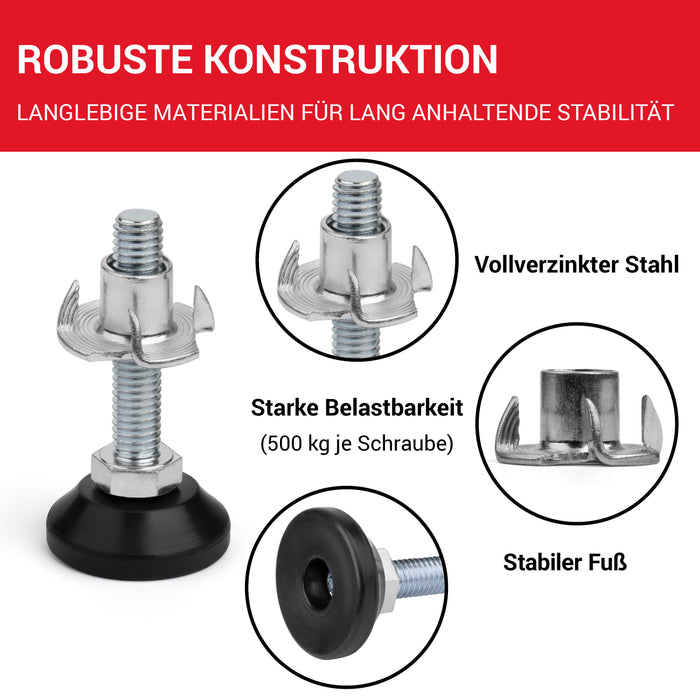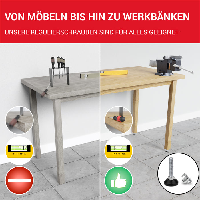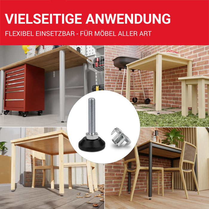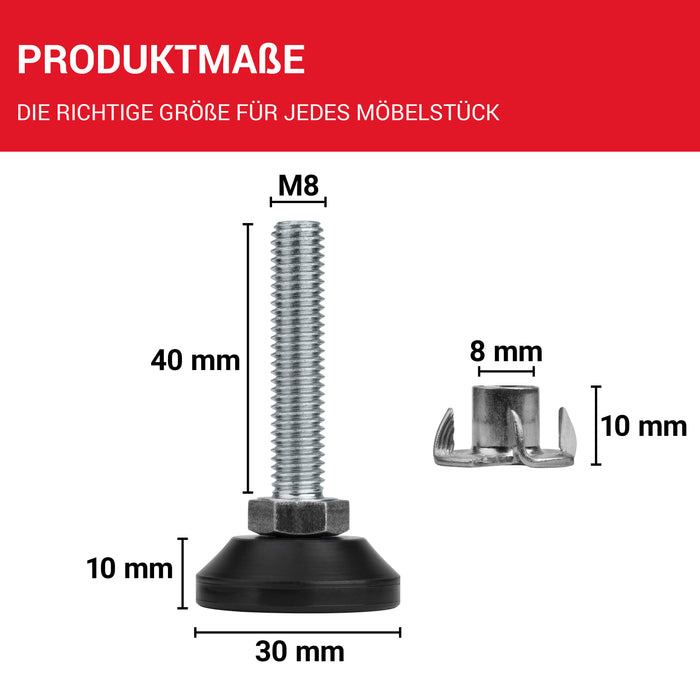 ??MAßE: Stellfüße M8 (Gewindedurchmesser), Gewindelänge 40 mm, Basisdurchmesser: Ø 30 mm drehbar aus schwarzem Kunststoff ?? ANWENDUNG: Die LouMaxx Stellschraube ist ein praktisches, hochwertiges Produkt als Tischbein Verlängerung, Maschinenfüße oder als verstellbare Möbelfüße, um z.B. Möbel, Schränke oder Regale zu justieren. ??QUALITÄT: Die vollverzinkten Schraubfüße aus Stahl bieten eine maximale Belastbarkeit von 500 kg. Der Schraubfuß eignet sich daher auch als Maschinenfuß M8 ??LIEFERUMFANG: 10 Verstellschrauben M8 x 40 mm, Fußteller: Ø 30 mm; 10 Einschlagmuttern