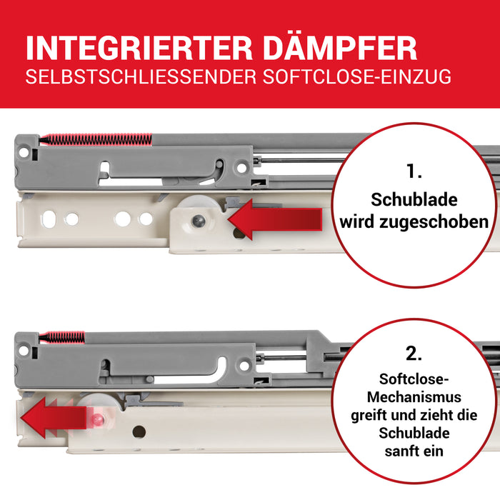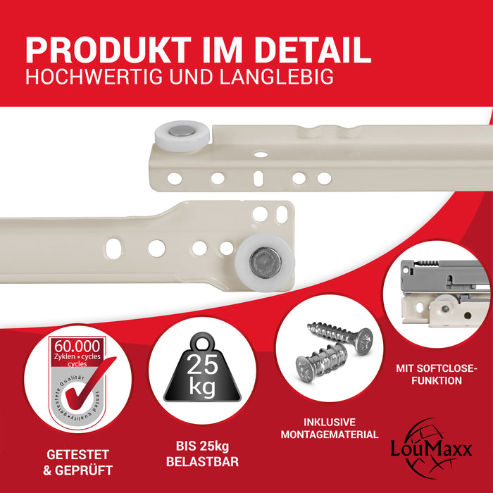- ✔️QUALITÄT: Die Schubladenschienen Softclose werden aus hochwertigem Stahl gefertigt und anschließend in Weiß pulverbeschichtet. Die Tragfähigkeit der Rollschienen für Schubladen – unabhängig von der Länge - liegt bei bis zu 25 kg. Leicht abgesenkte Bohrungen auf den Gleitschienen für Schubladen ermöglichen, dass die Montageschrauben planliegen.
