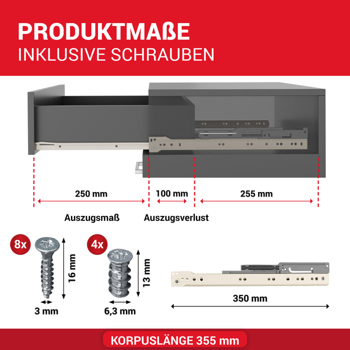 - ✔️EINFACHE MONTAGE: Dank der wenigen Bauteile lässt sich das Schubladen Schienensystem Softclose rasch und einfach montieren. Die Auszugschienen für Schubladen sind werkzeuglos aushängbar. Bemaßung: siehe Fotos