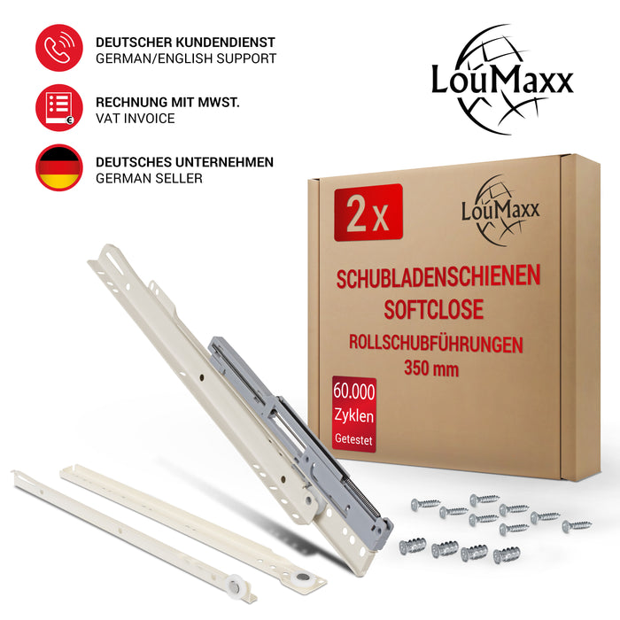 LouMaxx Rollschubführungen 350 mm | 2er Set (1 Paar) Schubladenschienen weiß | Schubladen Auszugsschienen Softclose | Leichtgängiger Rollenauszug in Weiß
